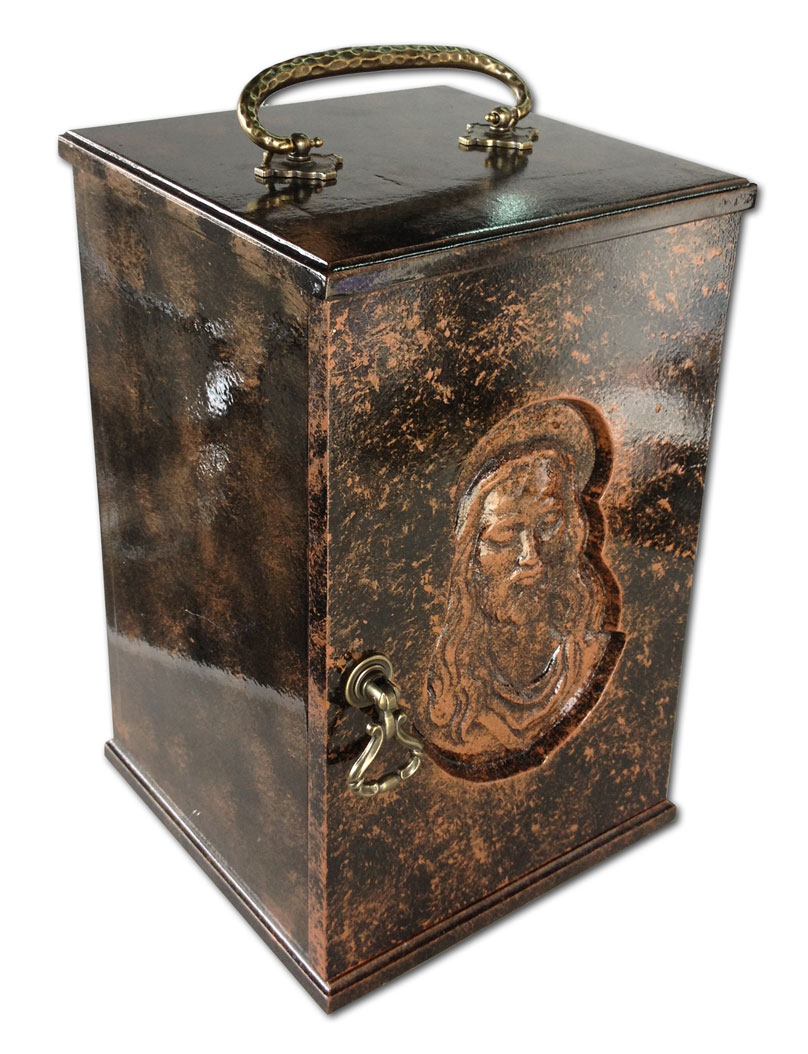 Embalaje fabricado en Fibran de 12 mm para major Estabilidad. Incluye Manecillas de Metal con acabado en bronce añejado. Este modelo tiene un lindo detalle en forma de rostro de Cristo. El color es cobrizo añejado con un acabado en brillante. Ademas posee un interior de satin en azul oscuro.