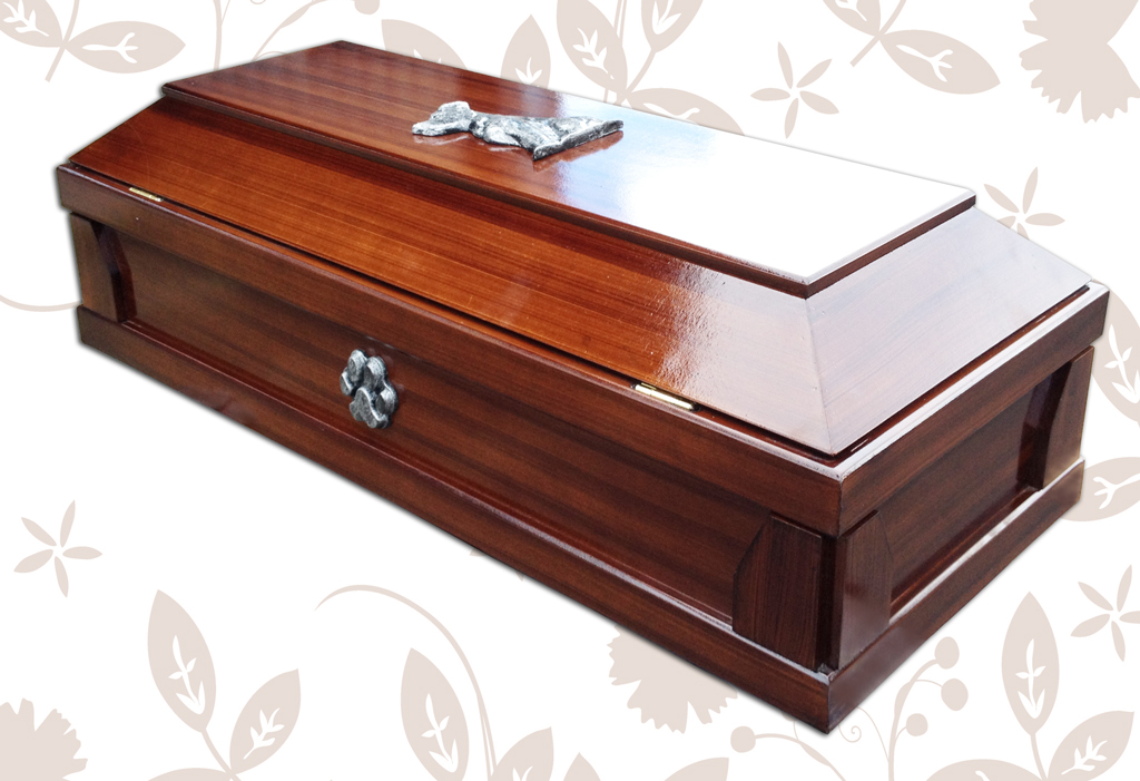 Ataud fabricado de madera tipo fibran. Color nogal en acabado barniz brillante. El interrior es decorado en tela satinado color blanco. Medias externas 76cm de largo por 32cm de Ancho por 23cm Alto. Mediadas Internas 71.5cm de largo por 27.5cm de Ancho por 21cm Alto. Tamaño ideal para Beagel, Amercian Standford, Pit Bull, Coker.