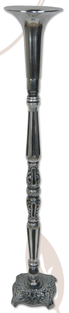 Ornamento tipo Florero Trompeta de aluminio y acero cromado. Este ornamente es hecho a mano y muy robusto. Posee una base redonda con un diametro de 30 cm. El ornamento mide 1.30 de alto y tiene un peso de 7 Kg