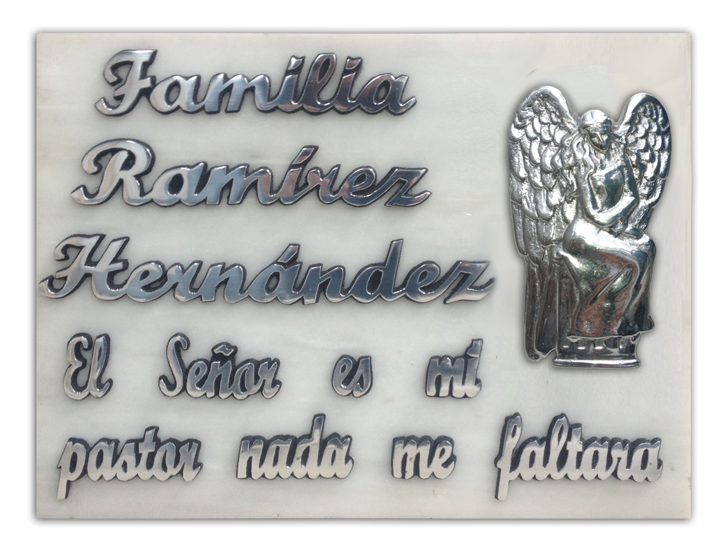 Placa de marmol pulido con letras de aluminio pulido y Ornamento en forma de Angel. Texto incluye Nombre y Frase.