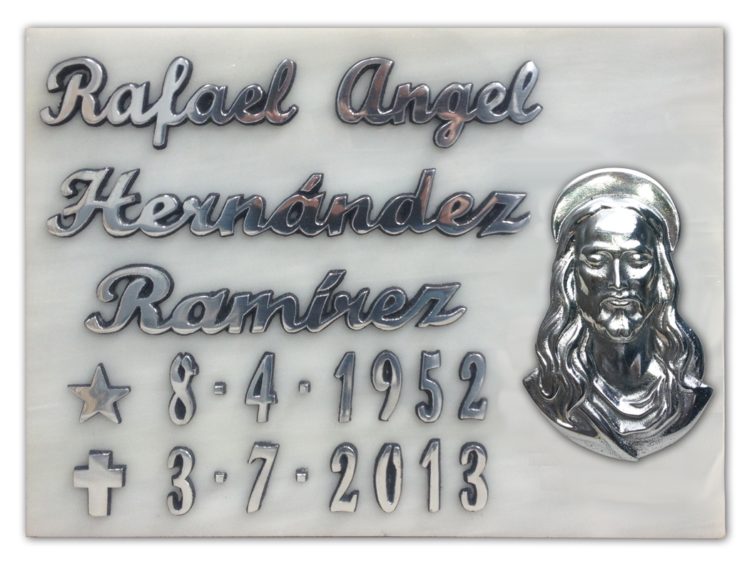 Placa de marmol pulido con letras de aluminio pulido y Ornamento en forma de rostro de Jesus. Texto incluye Nombre y Fecha