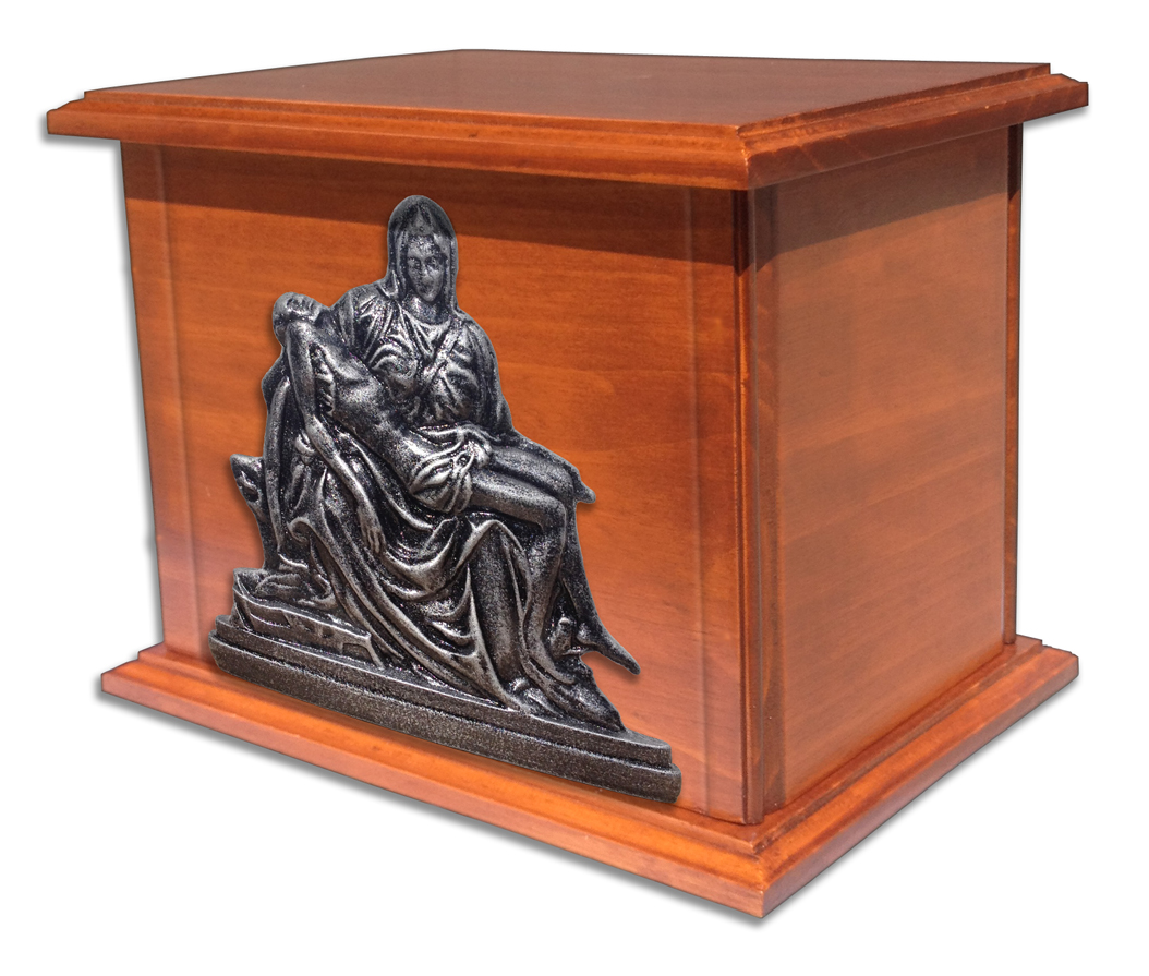 Urna trabajado en Pino curado con lindo relieve en forma de La Piedad acabado en un añejado plateado brillante. La urna es sellada por medio de tornillos por debajo.