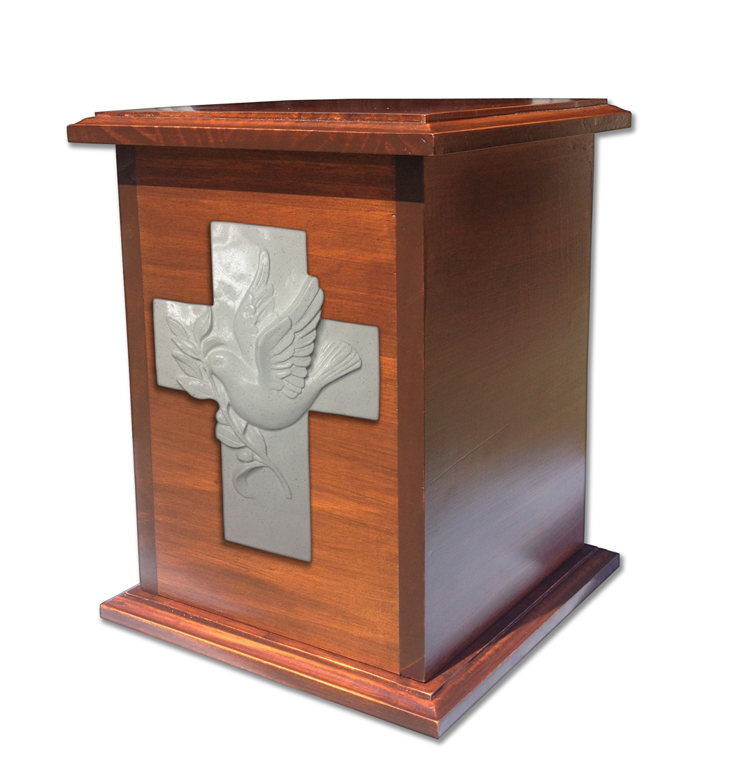 Urna trabajado en Pino curado con lindo relieve en forma de una Cruz con Paloma acabado en marmolina brillante. La urna es sellada por medio de tornillos por debajo.