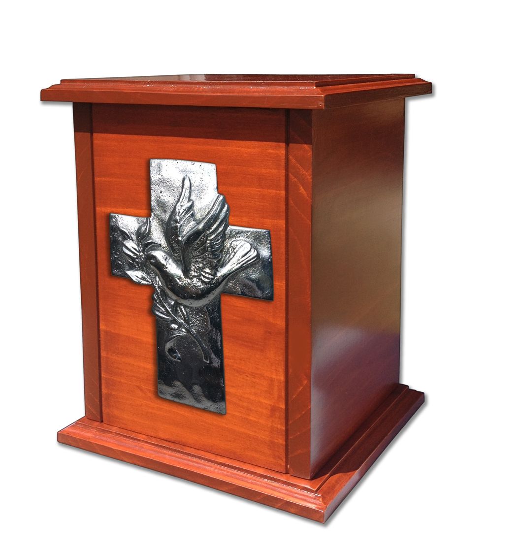Urna trabajado en Pino curado con lindo relieve en forma de Cruz acabado en un añejado plateado brillante. La urna es sellada por medio de tornillos por debajo.