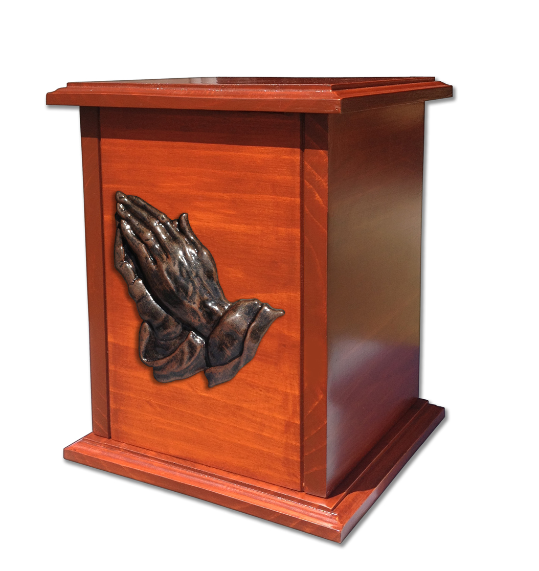 Urna trabajado en Pino curado con lindo relieve en forma de Manos Resando acabados en un añejado cobrizo brillante. La urna es sellada por medio de tornillos por debajo.