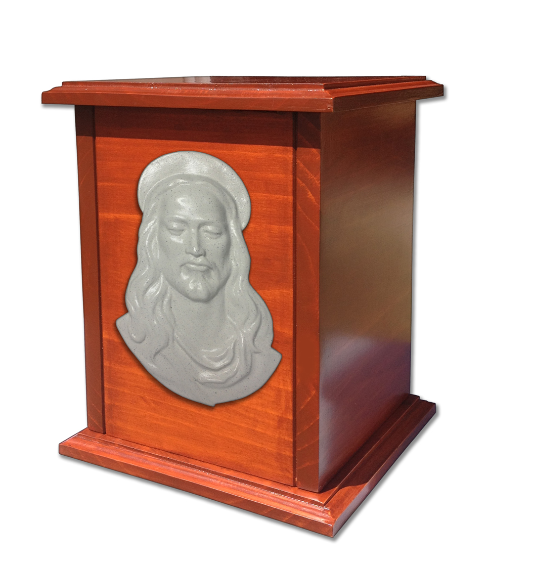 Urna trabajado en Pino curado con lindo relieve en forma de Jesus en marmolina brillante. La urna es sellada por medio de tornillos por debajo.