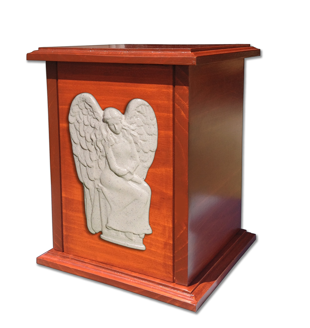 Urna trabajado en Pino curado con lindo relieve en forma de Angel en marmolina brillante. La urna es sellada por medio de tornillos por debajo.