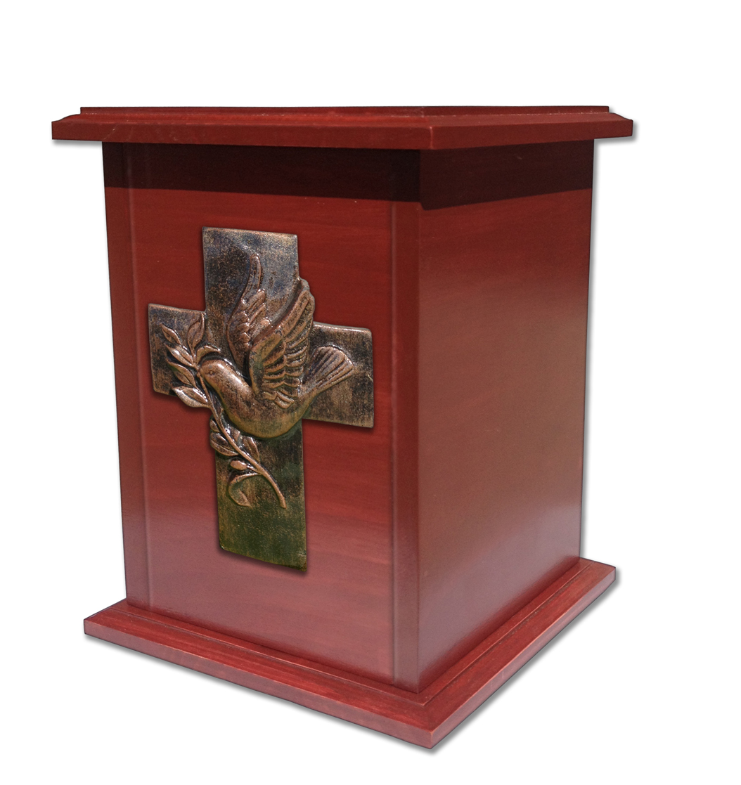 Urna trabajado en Pino curado con lindo relieve en forma de Cruz con Paloma acabado en un añejado cobrizo brillante. La urna es sellada por medio de tornillos por debajo.