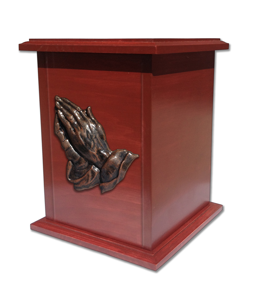 Urna trabajado en Pino curado con lindo relieve en forma de Manos acabado en un añejado cobrizo brillante. La urna es sellada por medio de tornillos por debajo.