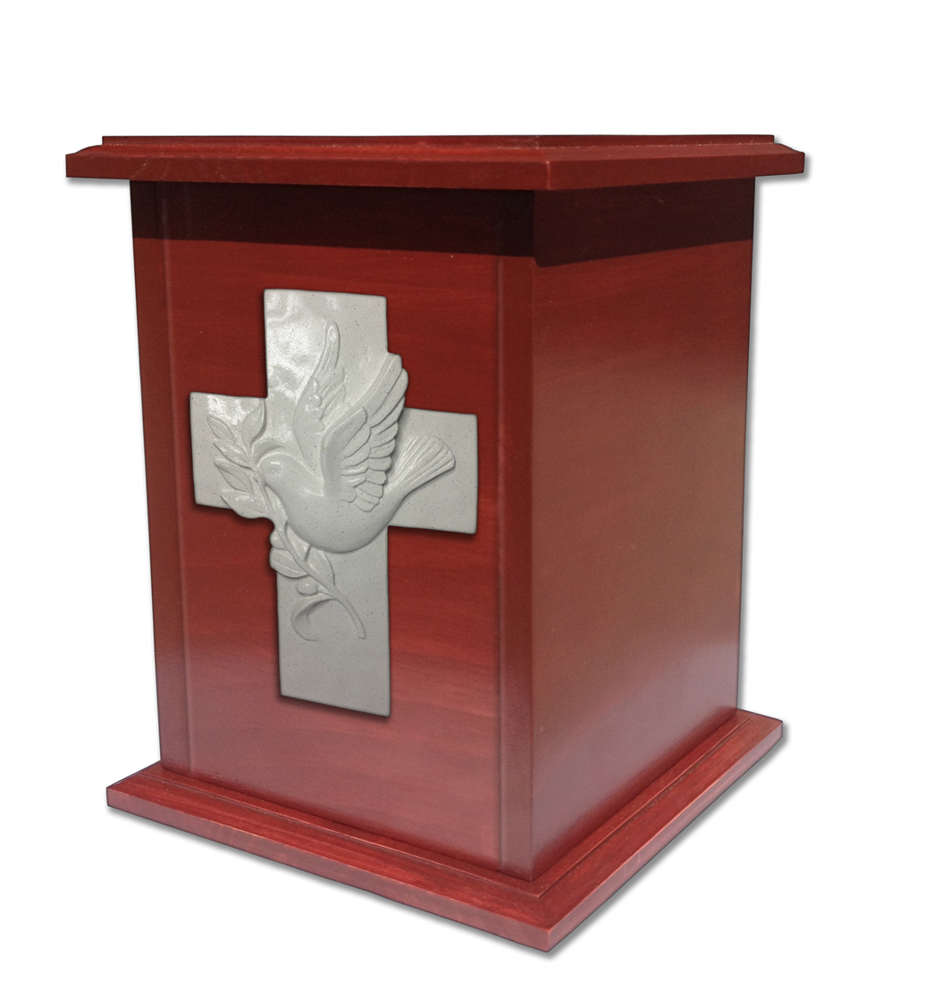 Urna trabajado en Pino curado con lindo relieve en forma de Cruz con Paloma en marmolina brillante. La urna es sellada por medio de tornillos por debajo.