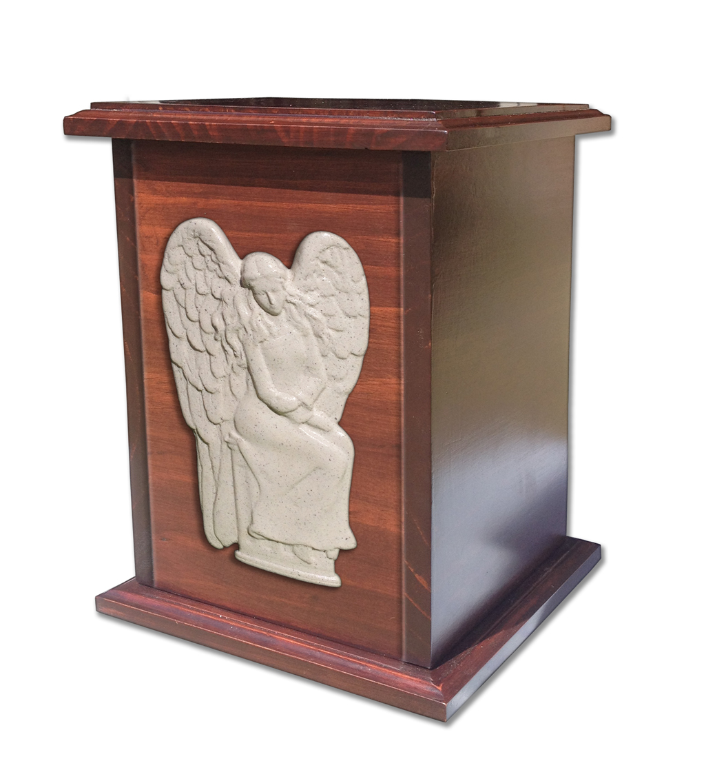 Urna trabajado en Pino curado con lindo relieve en forma de Angel acabado en marmolina brillante. La urna es sellada por medio de tornillos por debajo.
