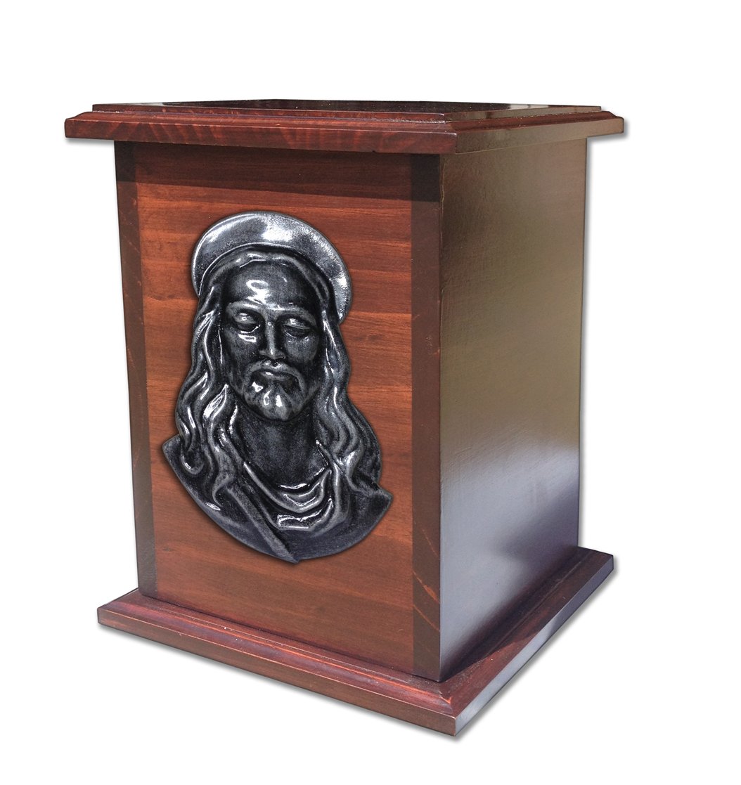 Urna trabajado en Pino curado con lindo relieve en forma de Jesus acabado en un añejado plateado brillante. La urna es sellada por medio de tornillos por debajo.