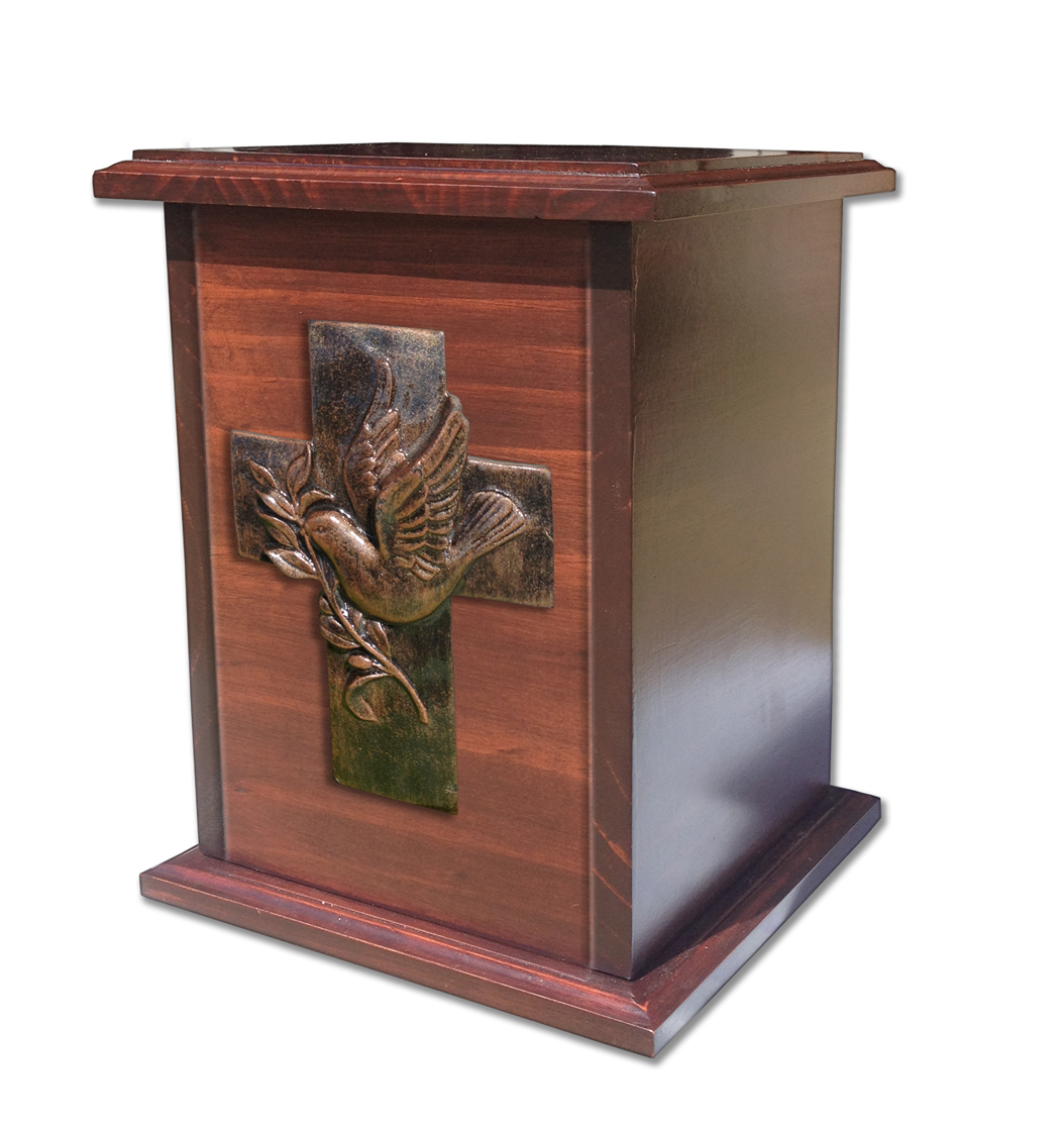 Urna trabajado en Pino curado con lindo relieve en forma de Crucifijo acabado en un añejado cobrizo brillante. La urna es sellada por medio de tornillos por debajo.