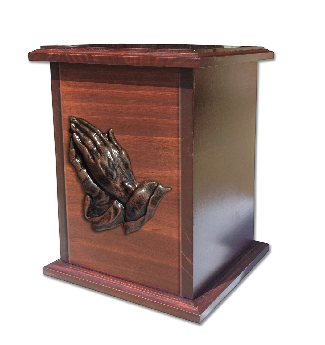 Urna trabajado en Pino curado con lindo relieve en forma de Manos Resando acabados en un añejado cobrizo brillante. La urna es sellada por medio de tornillos por debajo.